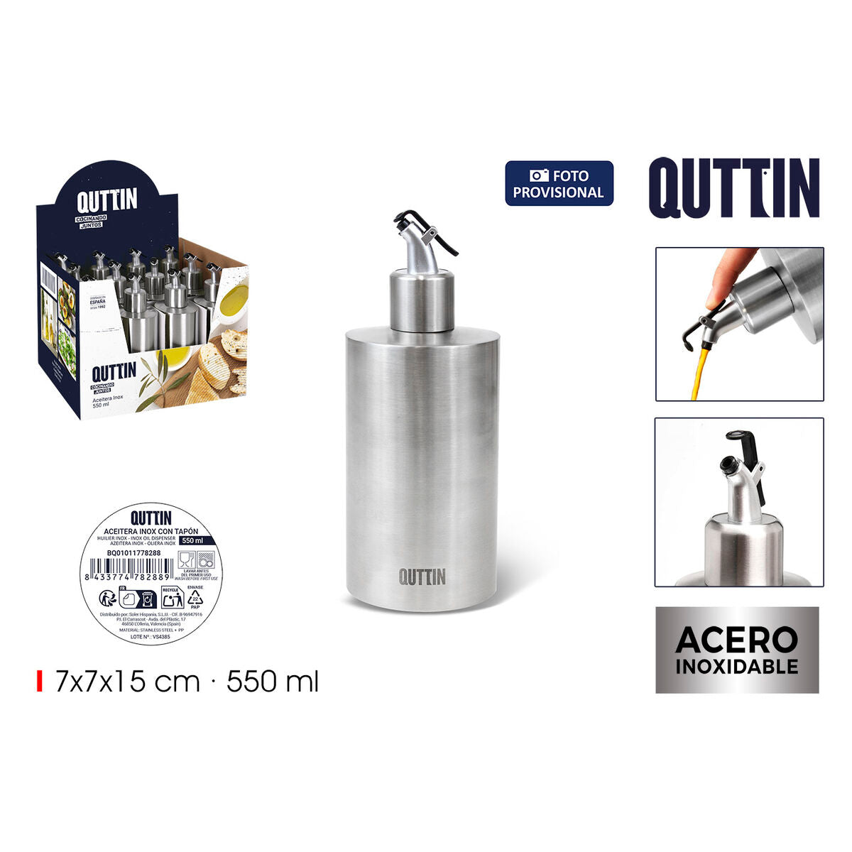 The Quttin oil dispenser is designed for practical and efficient kitchen use, offering optimal capacity with its 550 ml volume, allowing easy storage and dispensing of oil. Made from stainless steel, this material ensures durability and corrosion resistance, while also being easy to clean and maintain hygienically. The dispenser features a cap that provides a secure closure to prevent spills and preserve the quality of the contents, enabling controlled and precise pouring, ideal for dressing and cooking. This product is sold in a pack of 12 units, suitable for use in restaurants, catering, specialty stores, or households seeking convenience and quantity in a single format. Its functional design and materials position it as a basic and reliable tool for those who value a balance of practicality and durability in kitchen utensils for storing and dispensing edible oils. In short, the Quttin oil dispenser is a versatile and long-lasting solution that meets daily oil storage and handling needs in any culinary setting.
